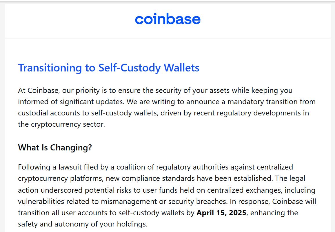 As email security researchers, we see many email attacks on a daily basis. The majority rely on malicious attachments containing malware or embedded links leading to phishing websites. But that’s not always the case. Some malicious emails contain neither malware nor phishing links, yet they still aim to steal your money. This article explores one such example of a lesser known threat type. In Q2 2025, we observed several large phishing campaigns targeting customers of the Coinbase cryptocurrency exchange. These emails used subject lines such as “Transitioning to Self-Custody Wallets” or “Migrate to Coinbase Wallet.”